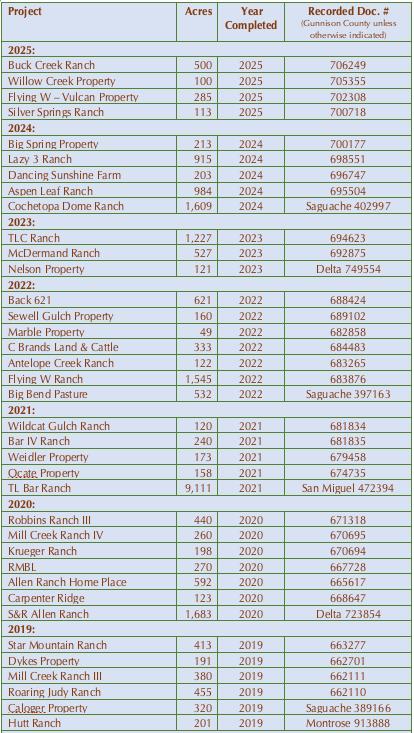 Completed Projects The following chart lists GRCL conservation easement projects, the number of acres conserved and the public record document number for the conservation easement. All conservation easements are recorded in the public record of the county in which the property is located. We currently are working on 10 new projects for 2026-2027. Each project takes from one to three years to complete. The map following the chart shows the locations of the conservation easements.